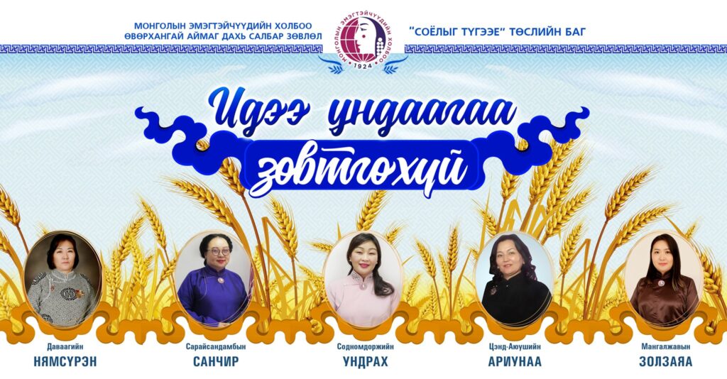 Амралтын өдрийн мэнд хүргэе ээ. Аймгийн Эмэгтэйчүүдийн зөвлөлийн “СОЁЛЫГ ТҮГЭЭЕ” төслийн 5 дахь сарын аян маань 8 дугаар сард “ИДЭЭ УНДААГАА ЗӨВТГӨХҮЙ” сэдвээр Та бүхэнтэйгээ хөөрөлдөхөд бэлэн боллоо.